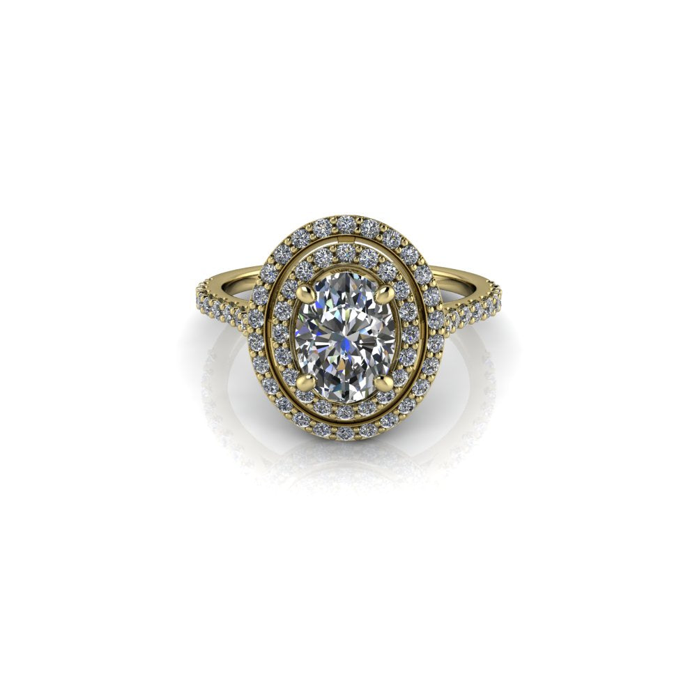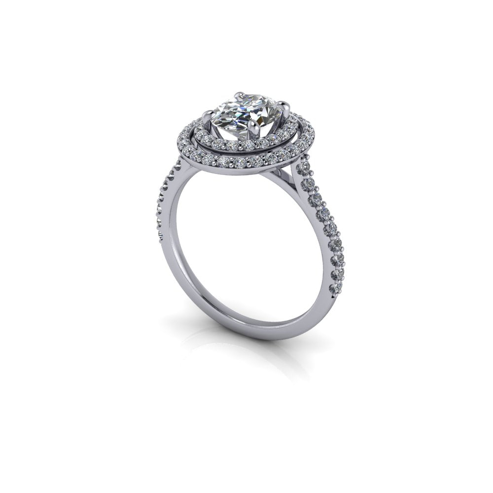 The Luna design is a classic solitaire design showcased here with a Oval-cut diamond in the center and round accent diamonds in the double halo and down the shank. As with most of our designs, we can manufacture this ring in various metals and with the stone of your choice.