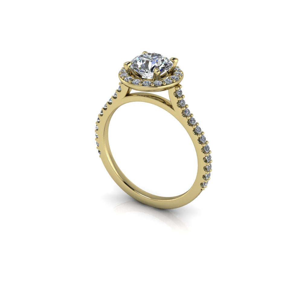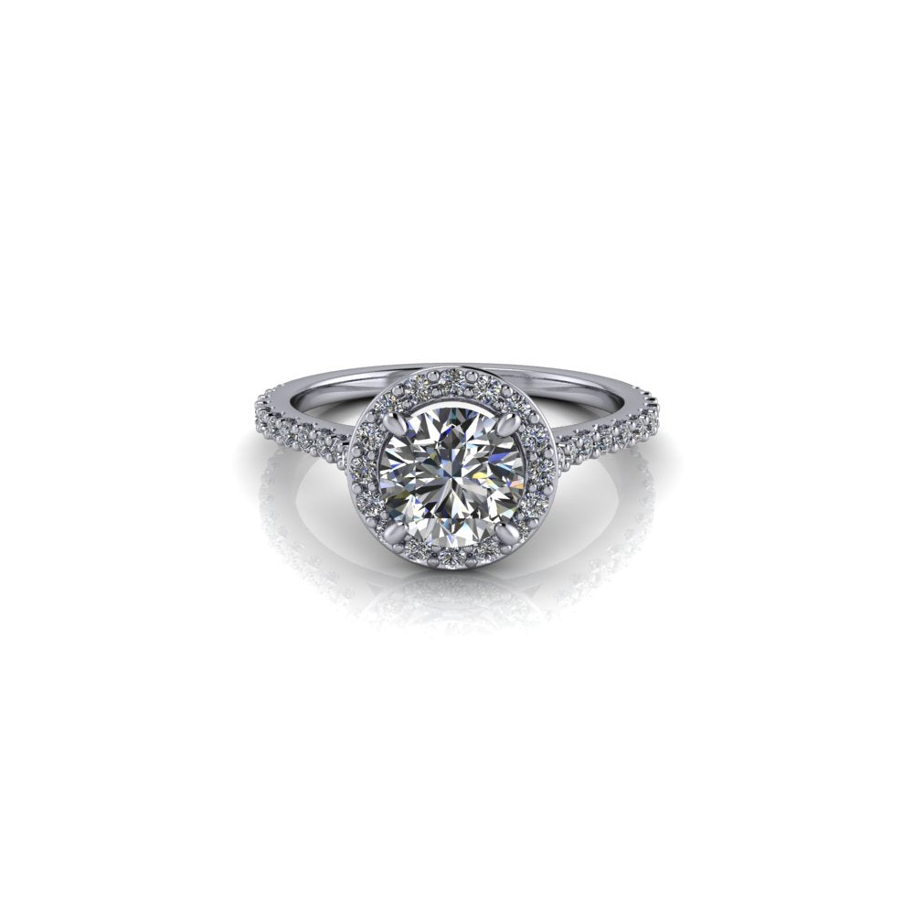 The Amelia design is a classic solitaire design showcased here with a Round Brilliant cut diamond in the center with Round Brilliant-cut accent diamonds in the halo and down the shank. As with most of our designs, we can manufacture this ring in various metals and with the stones of your choice.