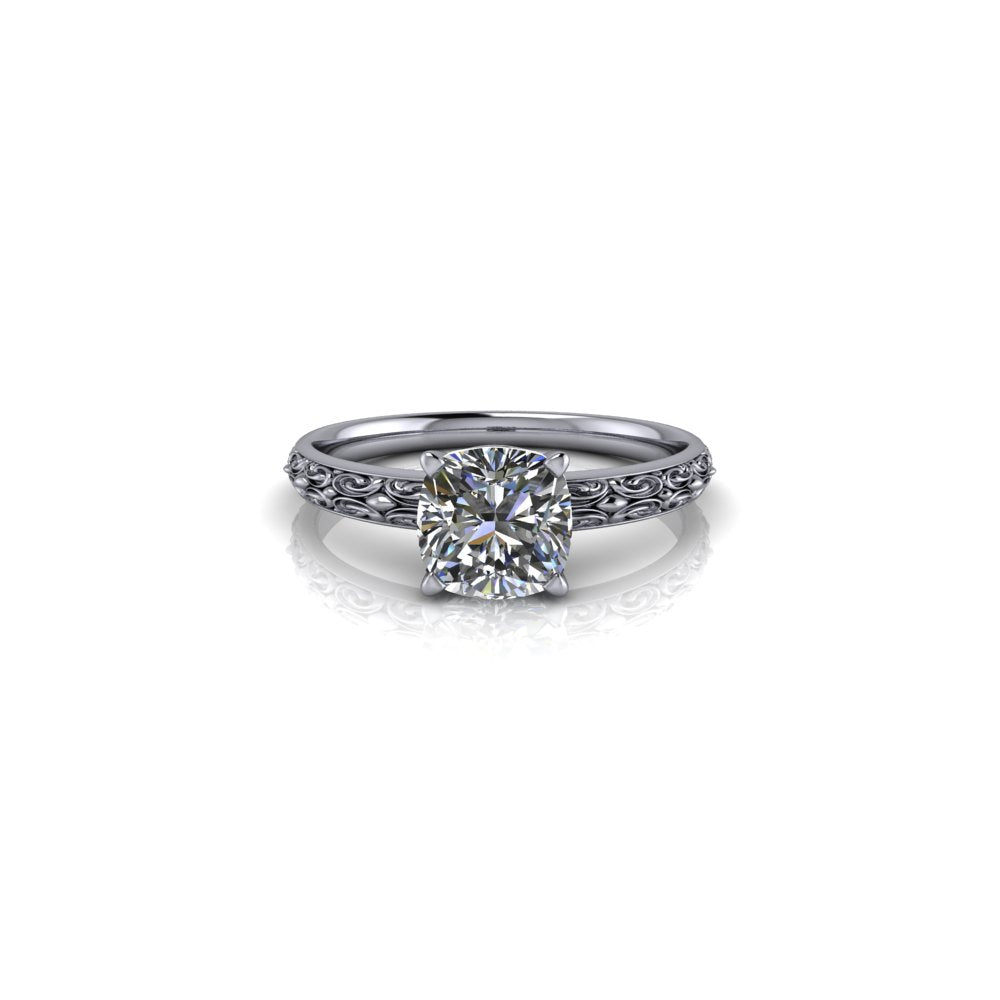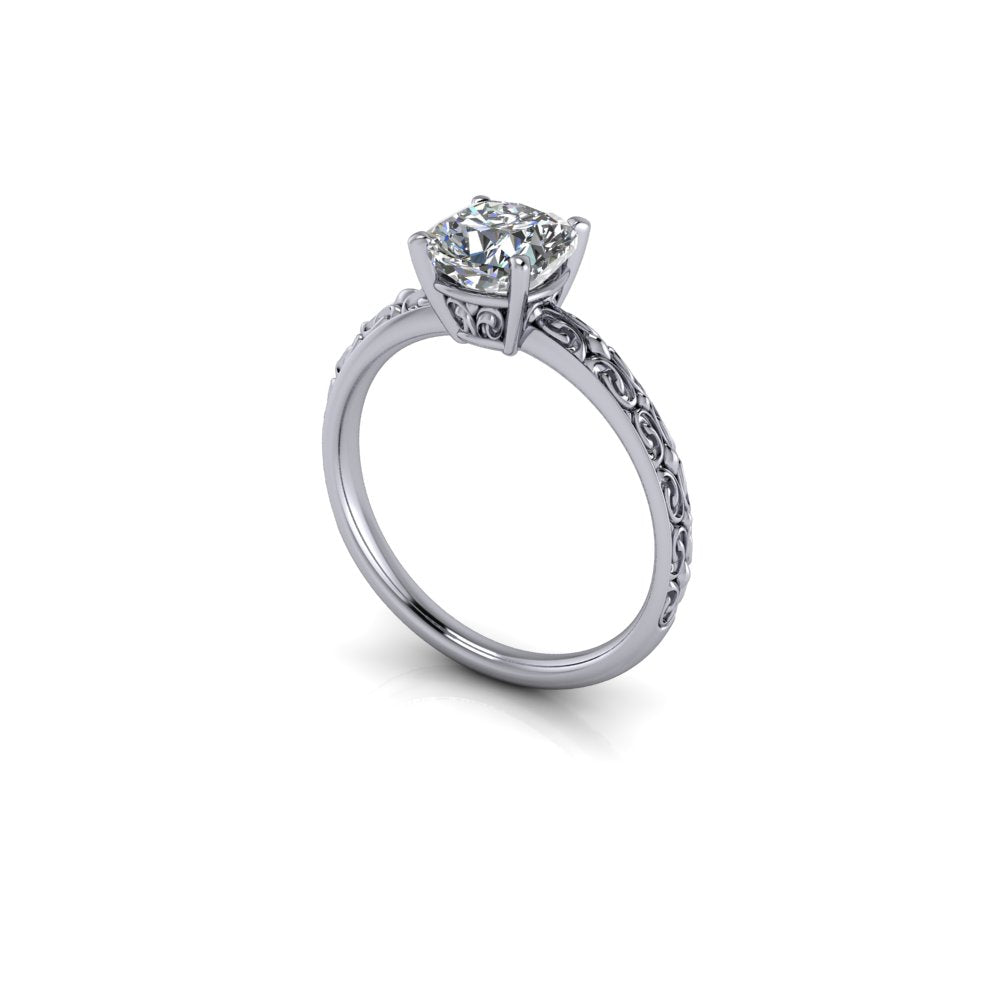 The Penelope design is a vintage solitaire design showcased here with a Cushion cut diamond in the centre complimented by an engraved shank. As with most of our designs, we can manufacture this ring in various metal and with the stone of your choice.