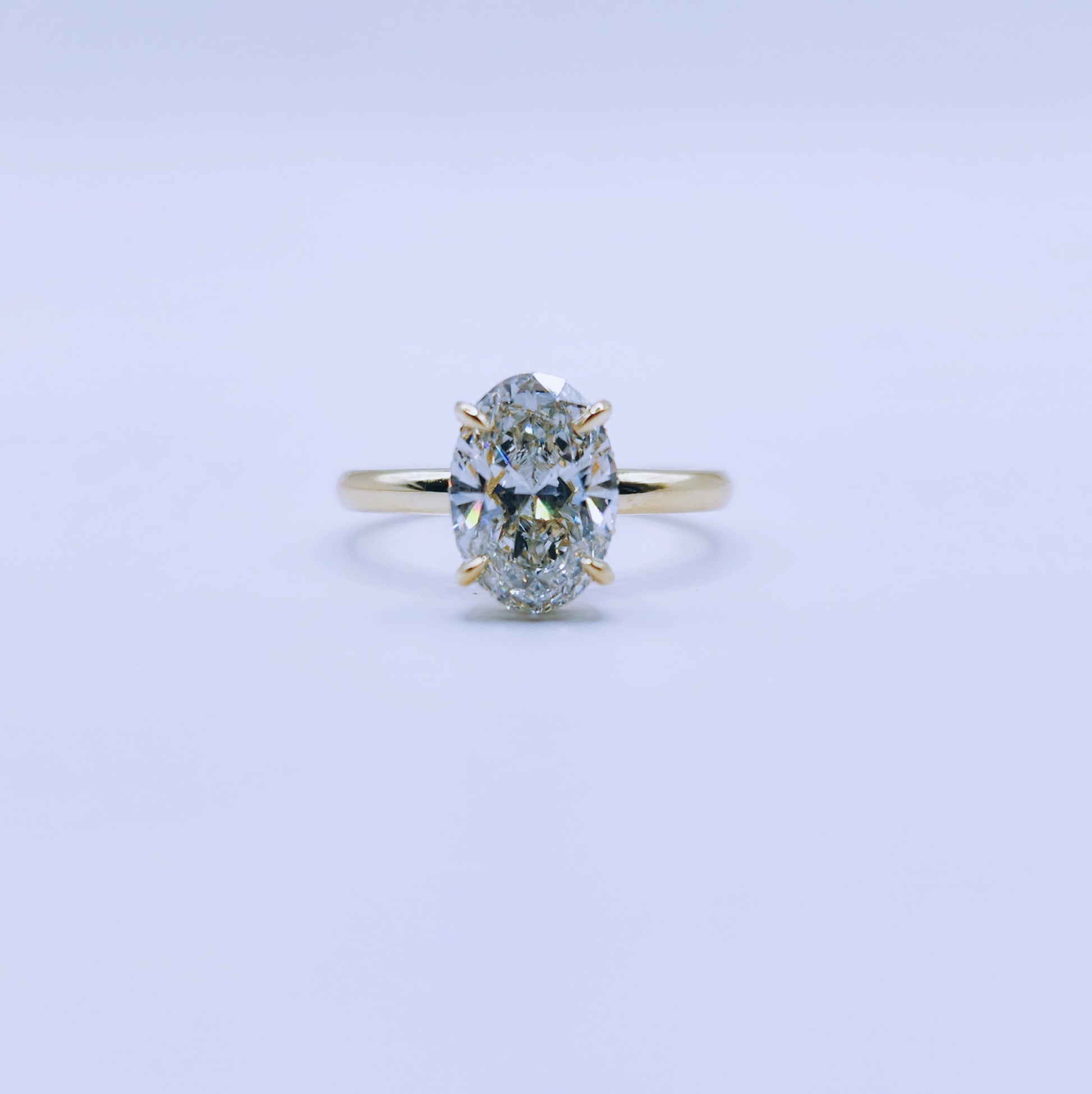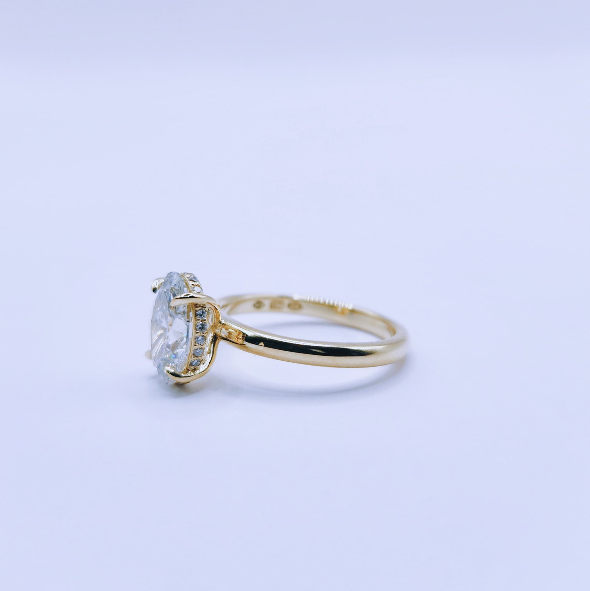 A modern classic in warm 18kt yellow gold, this engagement ring features a dazzling 2.22ct F VS1 lab-grown oval diamond as its centrepiece. A hidden halo adds subtle sparkle and depth without distracting from the main stone. Designed for understated elegance with maximum brilliance.
