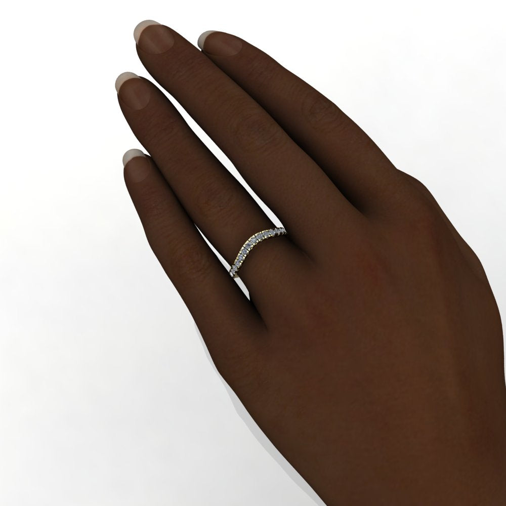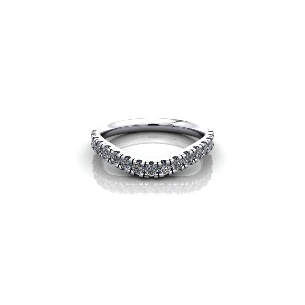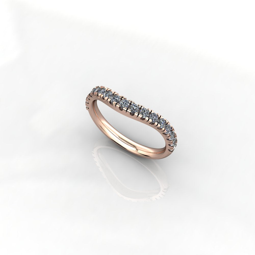 Each Aurora ring is crafted to order in your choice of metal — white, yellow, or rose gold, or platinum — and set with a fine row of round brilliant diamonds that capture light with every movement. The soft contour complements most solitaire and halo settings while maintaining a graceful stand-alone presence.